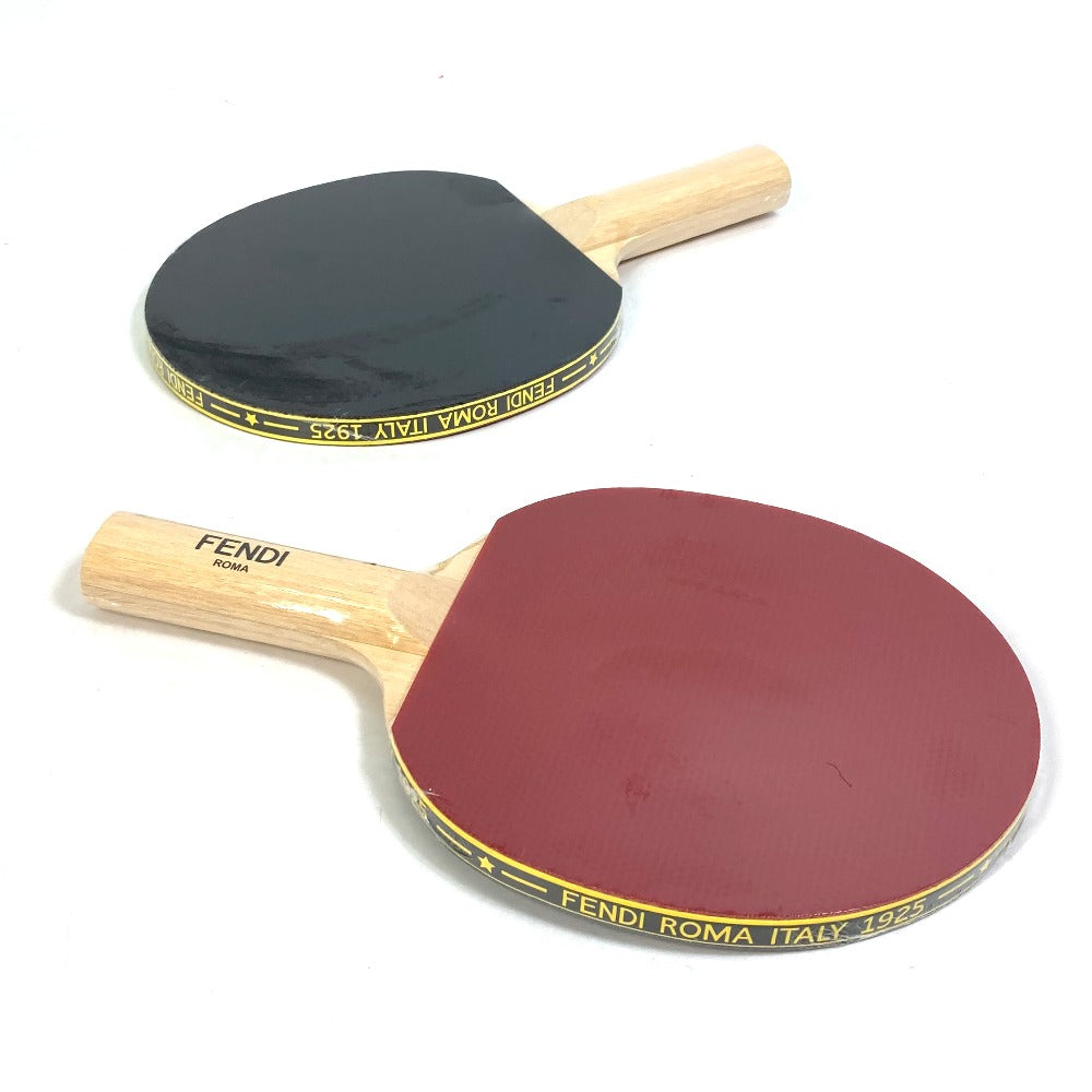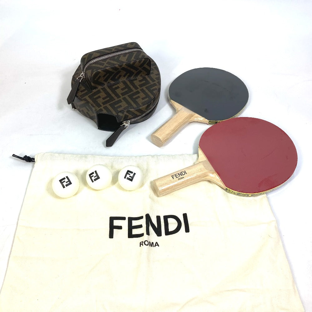 | Product Description | Ping pong set with a racket case with a zip pocket for the balls, a racket with a FENDI logo on the handle, and three balls with the FF logo. Made from a three-dimensional fabric with an FF motif in brown and tobacco colors. Brown leather details. |